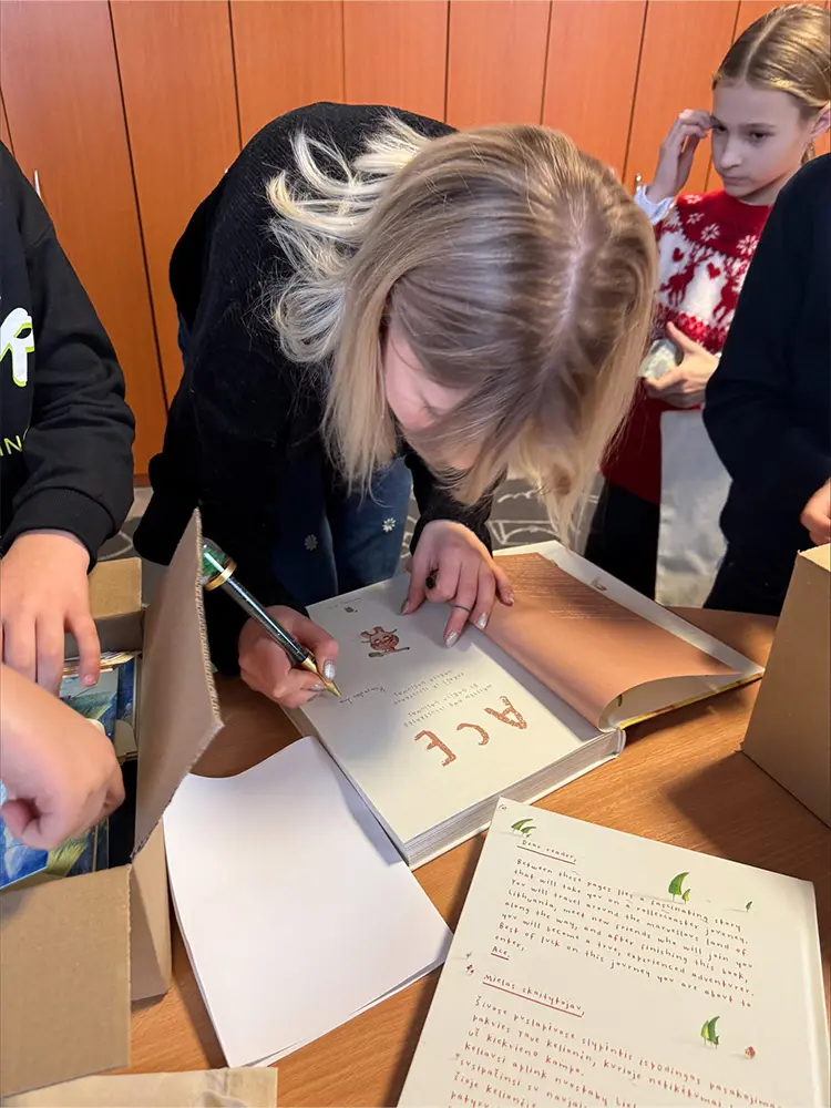 Iki šiol aplankiau daugiau nei 50 mokyklų, norėdama pasidalinti Ace pasauliu su jaunaisiais skaitytojais. Pristatymo metu tyrinėjame, kaip kuriama knyga – nuo pirmosios idėjos iki galutinio leidinio. Vaikai sužino, kaip kuriami personažai, kaip piešiamos iliustracijos ir kiek darbo bei kantrybės reikia, kad istorija gyvuotų.